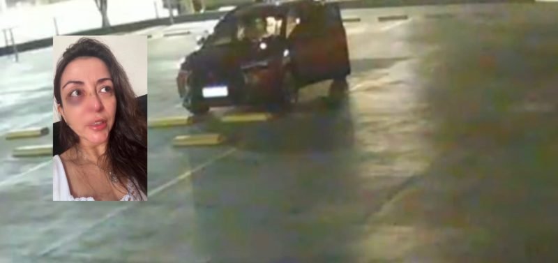 Os registros, captados por câmeras de segurança, mostram o casal no estacionamento. Em determinado momento, o homem começa a agir de forma violenta contra a mulher. As cenas se intensificam no interior do veículo, onde a vítima é agredida.